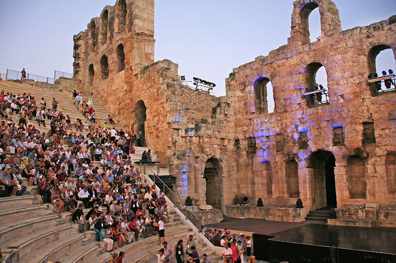En otra comunicación haré un recuento de algunas de las tendencias observadas, sin embargo, puedo adelantar que una de las secciones que más llamaron la atención de los pensadores por las ponencias recibidas fue la de “filosofía política”, sin embargo, no se advirtió el predominio de alguna corriente filosófica. Está por demás mencionar que se abordaron todos los temas y problemas habidos y por haber: desde estudios sobre filosofía clásica griega hasta la actualidad; desde la filosofía de la ciencia, la bioética y la tecnología hasta la metafilosofía; desde la hermenéutica, la fenomenología y el marxismo hasta enseñanza de la filosofía y filosofía práctica. Cabe señalar también que los anfitriones, encabezados por su presidente, el filósofo Konstantinos I. Boudouris y sus colaboradores desarrollaron una importante labor de organización. Finalmente, no puedo dejar de mencionar la extraordinaria ceremonia inaugural en donde pudimos ver y escuchar una combinación de música, canto y danza del más alto nivel artístico que se llevó a cabo en el Odeón de Herodes Atticus, al pie del Parthenon. Aquí van unas fotografías que amablemente me envió Sotiris Zafiris de la organización Diktyo Génesis.